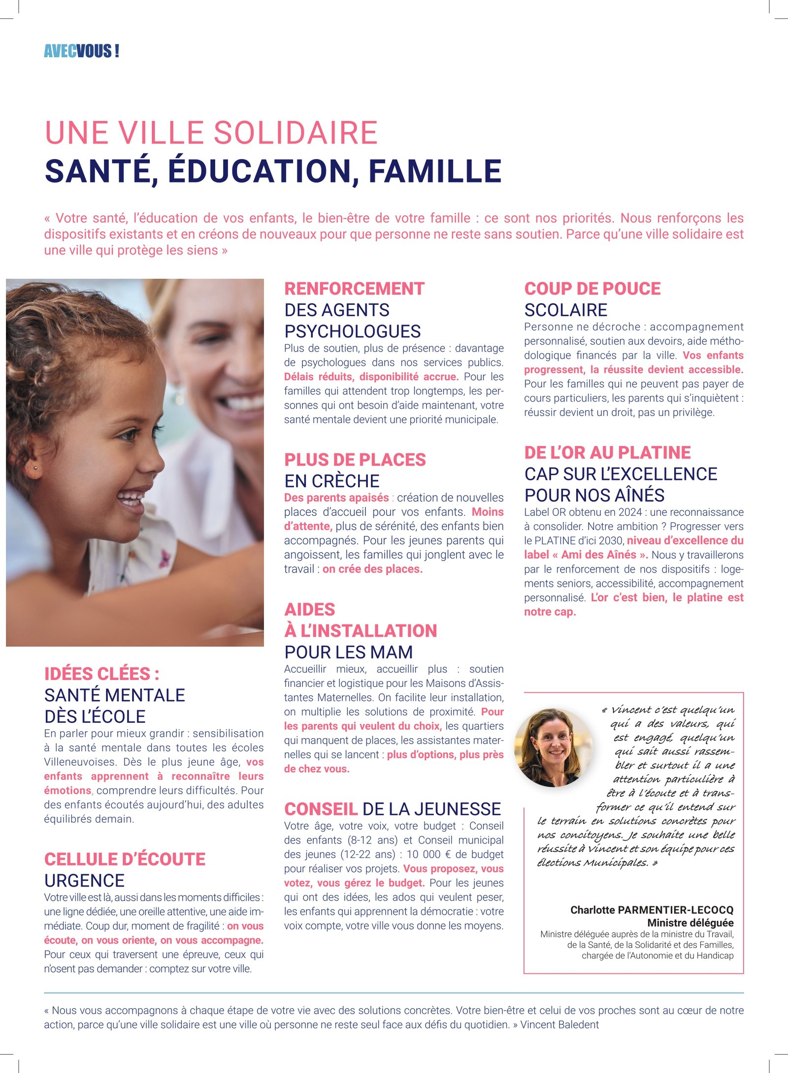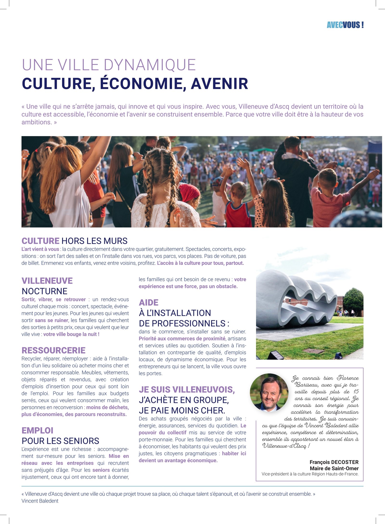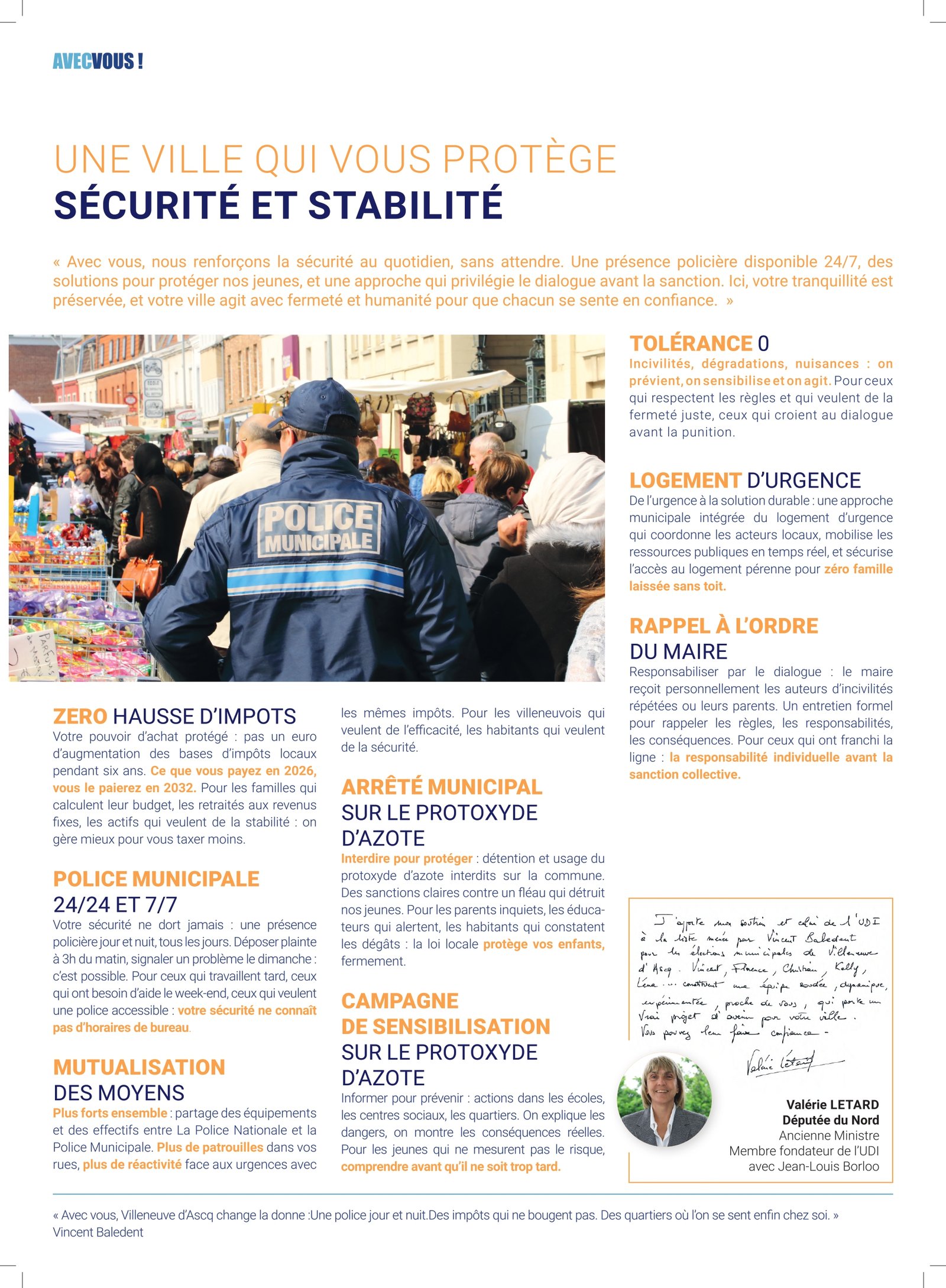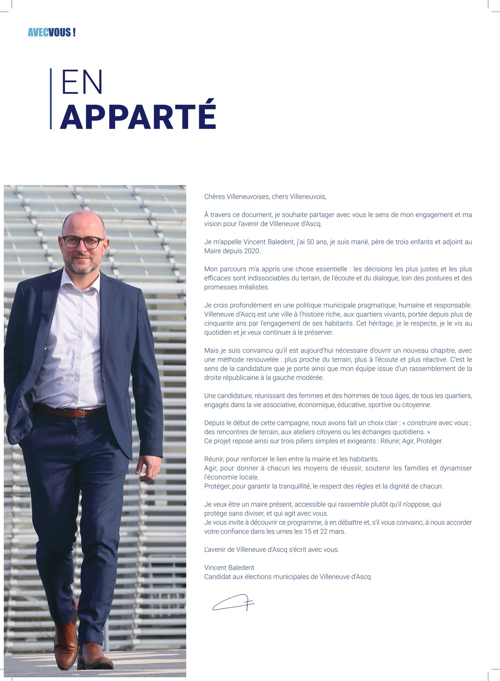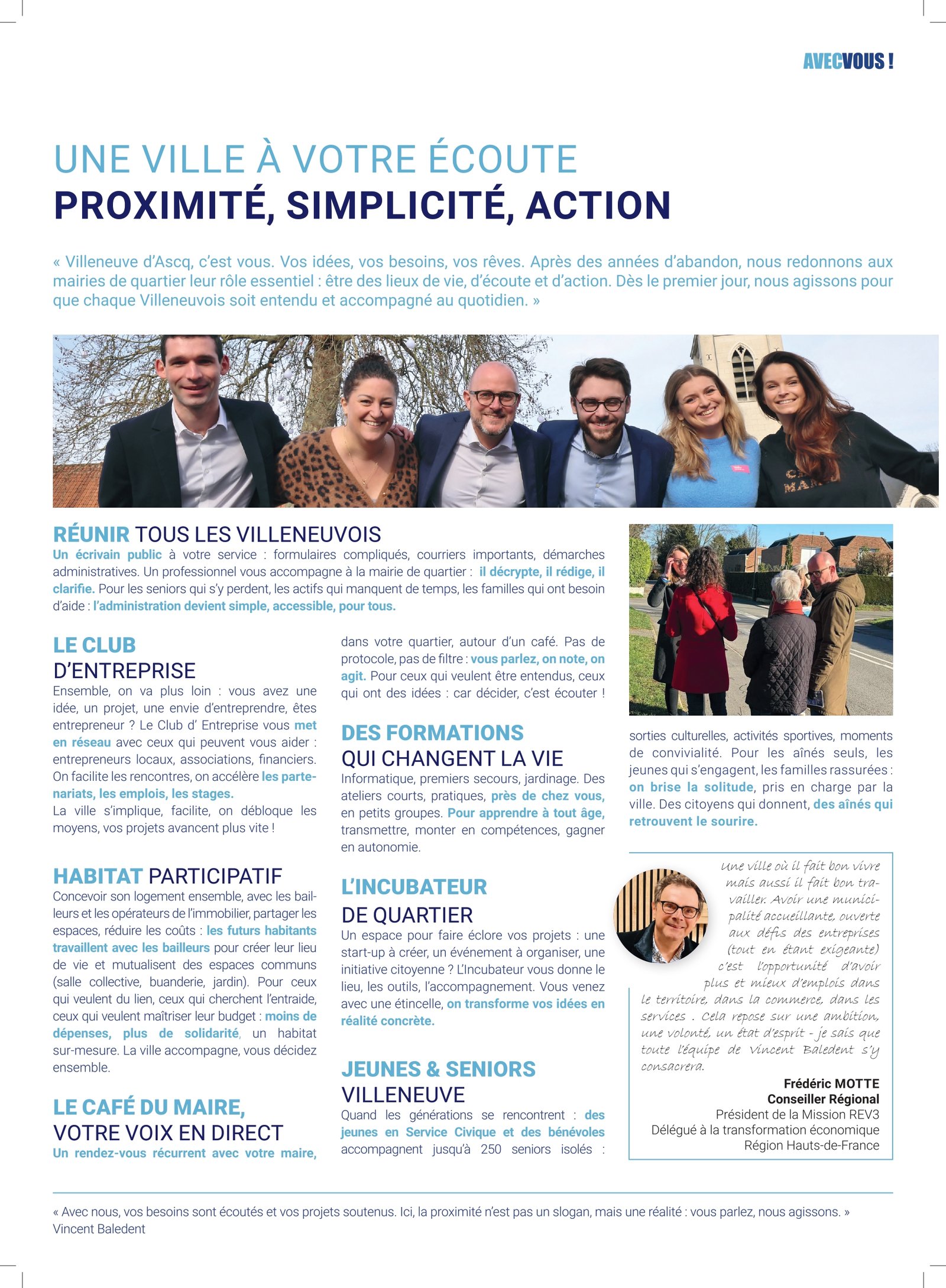 NOTRE PROGRAMME Notre programme pour les municipales de Villeneuve-d’Ascq (mars 2026) est à retrouver juste ci-dessous. Télécharger le programme PROGRAMME AUDIO 01 – En apparté 02 – Une ville à votre écoute – Proximité, simplicité, action 03 – Une ville solidaire – Santé, éducation, famille 04 – Une ville verte et mobile – Bougez, respirez, vivez mieux 05 – Une ville qui vous protège – Sécurité et stabilité 06 – Une ville dynamique – Culture, économie, avenir 07 – Une ville en action au cœur du territoire 08 – Agir dès les 100 premiers jours
